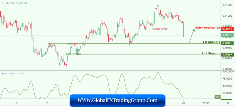 AUD/USD is approaching our first support at 0.7048 (horizontal overlap support, 61.8% Fibonacci retracement) where we might see a bounce to our major resistance at 0.7075 (horizontal pullback resistance, 38.2% Fibonacci retracement).