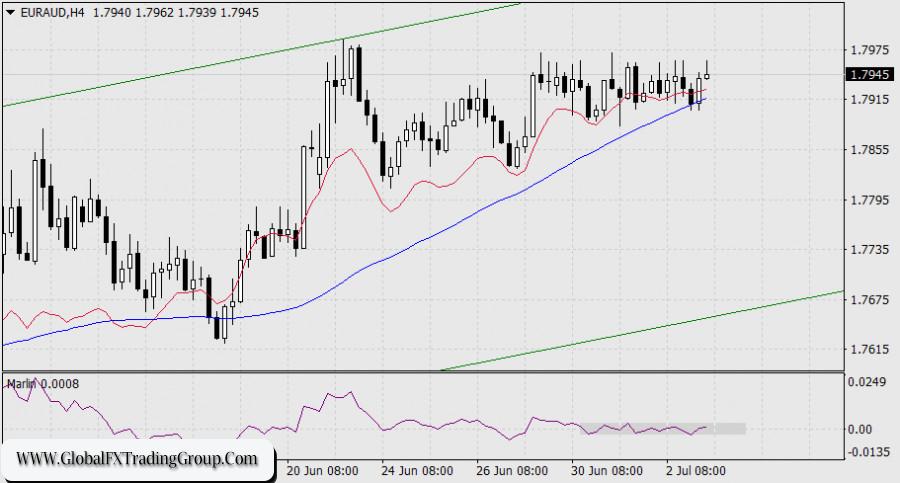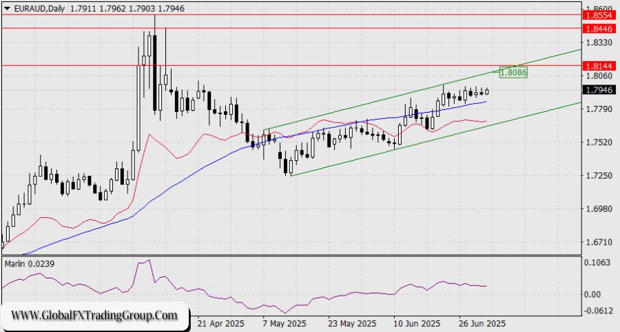 On the daily chart, the EUR/AUD pair is moving sideways in the upper half of the price channel and above the MACD indicator line. The signal line of the Marlin oscillator is slightly declining within positive territory, creating internal tension with the potential for an upward release.