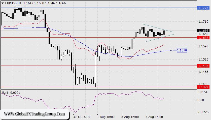 In this situation, either on August 15 or August 18, the euro could break down toward the nearest target at 1.1495 and then further to 1.1392. For an upward move to develop, the price must break above the August 7 high at 1.1699 (with the target at 1.1777 — the MACD line), while for a downward move, it must firmly consolidate below 1.1632.