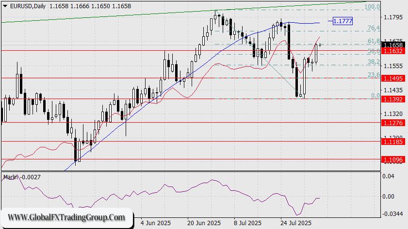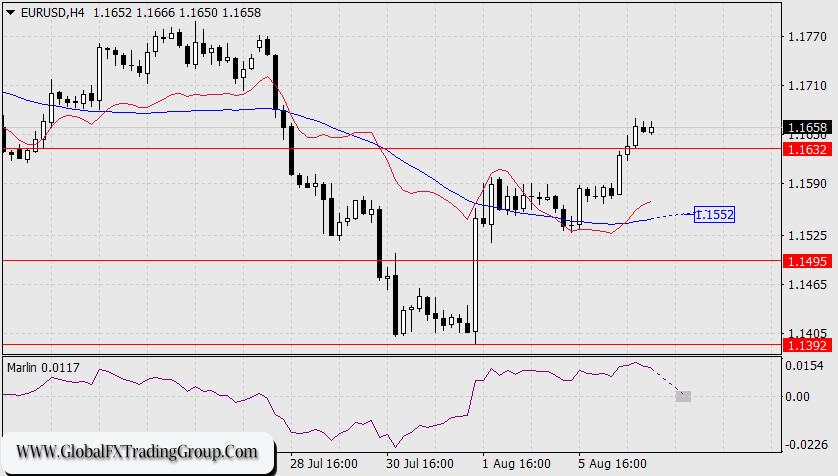 As a result of yesterday’s 84-pip rise, the euro broke above the target level of 1.1632, testing the balance indicator line. The correction from the downward move that began on July 1 reached 61.8%. However, the Marlin oscillator’s signal line has not yet moved into positive territory, which means a price reversal below 1.1632 remains possible. A consolidation below this level would return the quote to 1.1495.