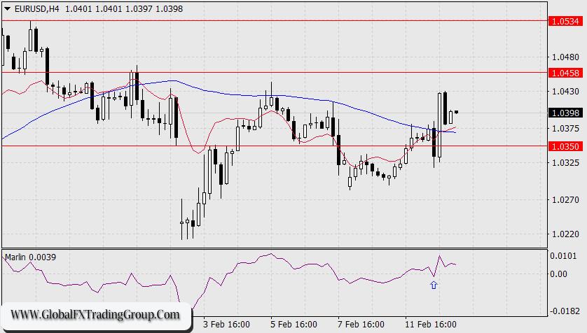 On the four-hour timeframe, the price has faced significant resistance from indicator lines but ultimately leaned in favor of the bulls. It has now consolidated above these indicator lines, and the Marlin oscillator has turned upward from the boundary that separates growth from decline. We anticipate further appreciation of the euro.