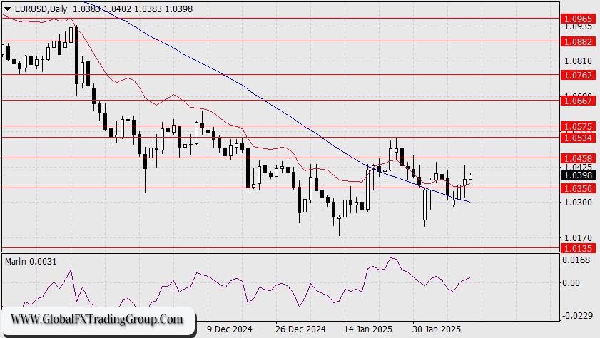 The euro has shown resilience and a strong desire to increase in value. Current momentum indicates an upward movement towards the first target of 1.0458. If the euro breaks above this level, it could pave the way for a target range of 1.0534 to 1.0575; however, sustained growth beyond this range remains uncertain. The daily chart indicates that the price is consolidating above the balance line, while the Marlin oscillator is rising within the bullish zone.
