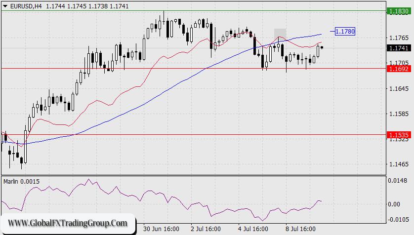 On the H4 chart, the Marlin oscillator’s signal line has settled in positive territory. The price’s growth is currently being held back by the balance line (red), and just above it lies the MACD line at 1.1780. The last time the price approached this line (gray square), it failed to break through its resistance. Overall, the price is moving sideways and waiting for new external catalysts.