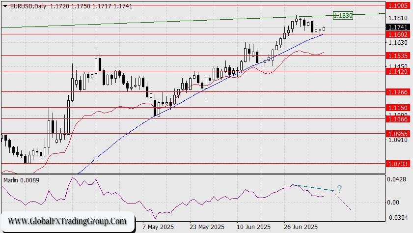 Markets continue to test risk-on strategies—yesterday, the S&P 500 rose by 0.61%, oil slipped by 0.22%, and the euro declined by just 4 points, which, given the low daily volatility, can be considered a neutral result. After rebounding from the 1.1692 level yesterday, the euro is showing stronger gains this morning (+20 points). The price has likely opted to retest the upper boundary of the price channel at 1.1830.