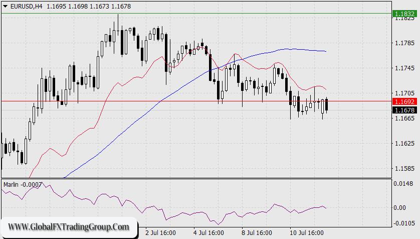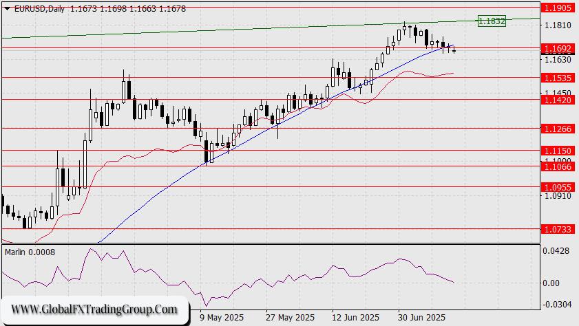 Friday’s candlestick for the EUR/USD pair closed bearish, with the price consolidating below the daily MACD line. The objective for today is to secure a close below the 1.1692 level. To achieve this, the daily candle must close below that level. The Marlin oscillator has not yet entered negative territory, but visually it is expected to do so tomorrow. Therefore, today is expected to be calm.
