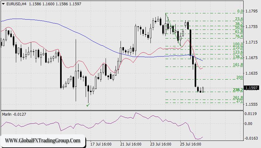 Now, the focus shifts to the break of the nearest support at 1.1495 (the February 2022 high), which would pave the way for the next target at 1.1380 (resistance in May, support in June of the current year). On the four-hour chart, the price has paused at the 238.2% Fibonacci reaction level. As the signal line of the Marlin oscillator is turning upward, a minor correction is possible.