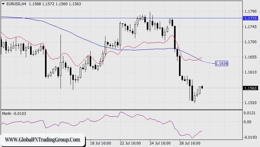 On the H4 chart, the picture is also fully bearish: the price is declining below downward-sloping indicator lines, and the Marlin oscillator has made a mild correction — a release of pressure to allow for a smoother continuation of the decline. However, if the price breaks above the MACD line (1.1636), an attack on the daily MACD line at 1.1770 becomes possible. But that would be an alternative scenario.