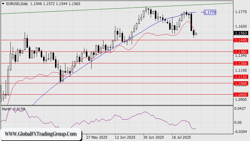 The current situation on the daily chart is bearish: the price is holding below the indicator lines, the MACD line has turned downward, and the Marlin oscillator is declining in the negative zone. The only question is: how strong will the FOMC signal be regarding a possible rate cut in September? We believe it won’t be particularly strong — possibly just one rate cut before the end of the year, without further changes in December. This is due to inflation, which has started to rise again.