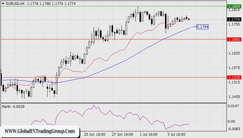On the H4 chart, the price remains close to the balance line and is attempting a natural approach toward the MACD line (1.1744) to break through its support. A firm move below this level would lead to price consolidation in preparation for a breakout under 1.1692.
