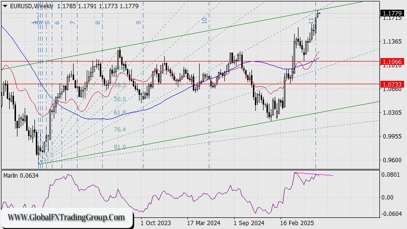 On the weekly chart, the price has precisely reached the intersection point of the Fibonacci ray and the upper boundary of the price channel. This occurred on the first bar after the 11th Fibonacci time line — a point which, in most cases, marks the beginning of a trend reversal. The divergence between the price and the Marlin oscillator further reinforces this signal.