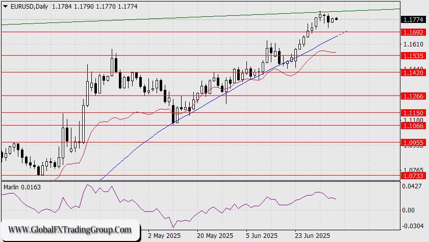Such a catalyst may come today from Germany’s industrial production data (forecast: –0.6% for May) and eurozone retail sales (forecast: –0.8% for May). The Marlin oscillator is also indicating a strengthening bearish trend. A break below the 1.1692 support level could occur on Tuesday or Wednesday, which would also mean a breach of the MACD line support. This would open the path toward the 1.1535 target.
