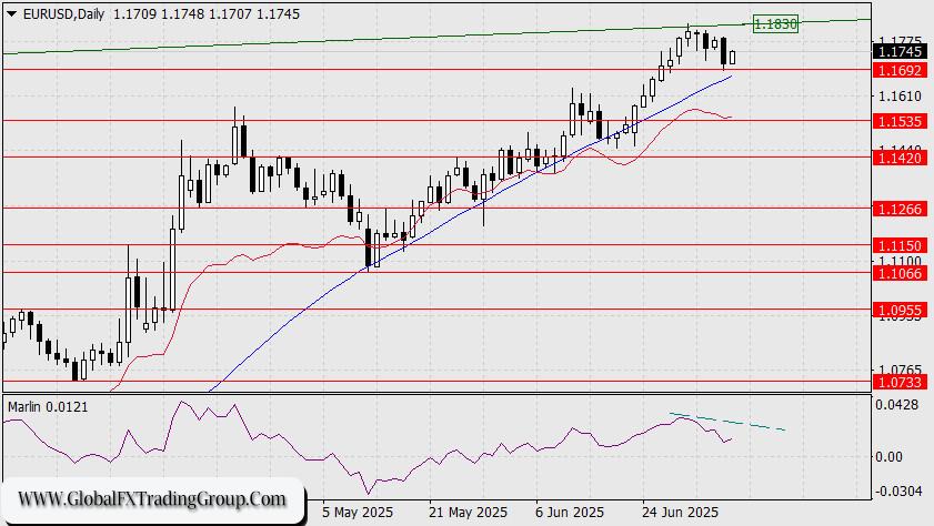 A close below the 1.1692 level today would not yet confirm the target at 1.1535, as the MACD line on the daily chart would still be intact. However, a renewed attack on the 1.1692 support tomorrow—if successful—could be a decisive step toward forming a medium-term downtrend.