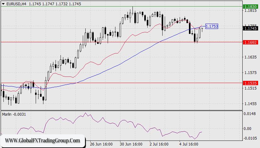 On the four-hour chart, the corrective upward movement of the last two candles encountered resistance at the balance and MACD indicator lines. A consolidation above the MACD line, above the 1.1753 level, would allow the price to once again reach this month’s high.