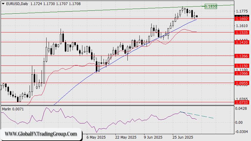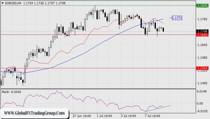 On Tuesday, the euro attempted a downward move but failed to reach support at the MACD line, stopping at the target level of 1.1692. The day closed with a white candlestick, increasing the likelihood of a price rebound toward retesting the upper boundary of the price channel at 1.1830.