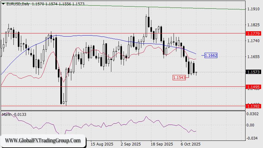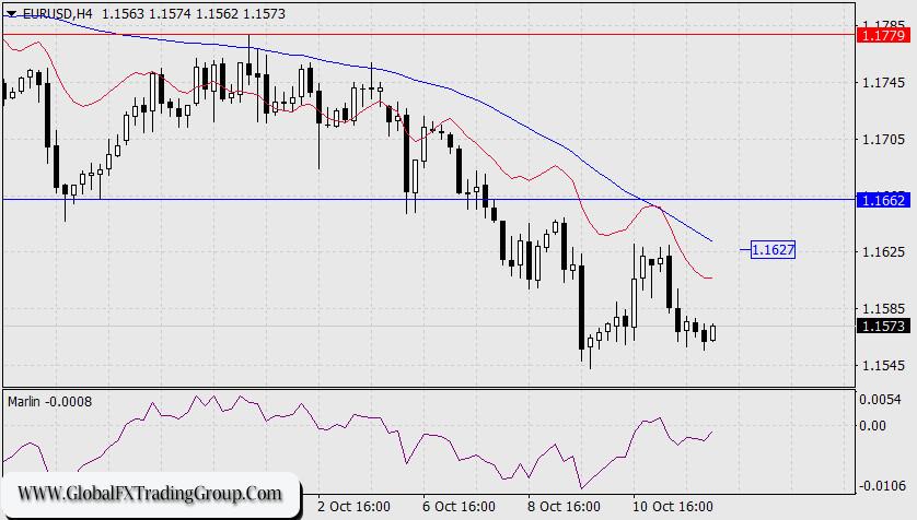 However, this consolidation is occurring below both declining indicator lines, while the Marlin oscillator remains in a downward trend zone. Therefore, if the price falls below Friday’s low of 1.1543, it will complete the full downward movement that began on September 17, reaching support at 1.1495. Conversely, if the price breaks above yesterday’s high (either today or tomorrow), it will aim for an attack on the MA line at 1.1662.