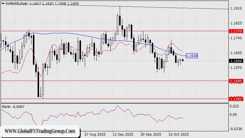The euro is recovering — slowly but steadily — after a three-day decline between October 17 and 21. A key development would be a daily close above the MACD line at 1.1638, which could provide upward momentum and accelerate the current recovery.