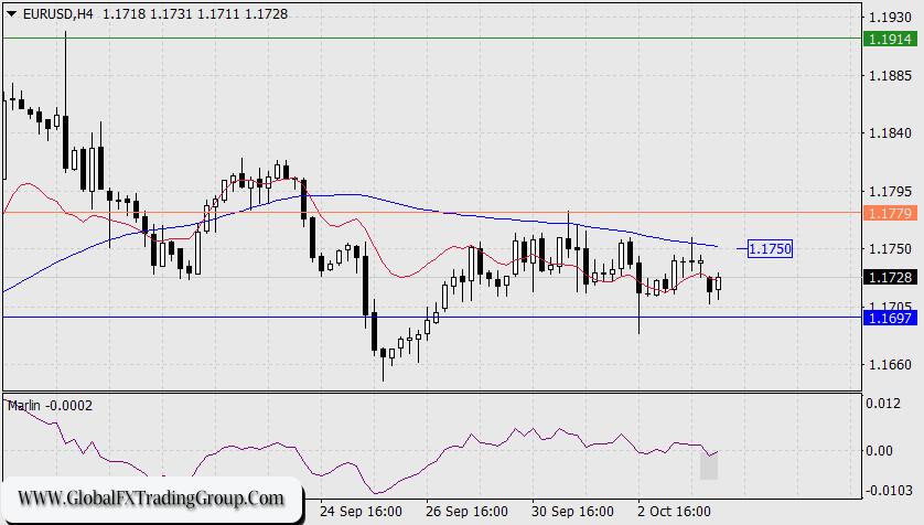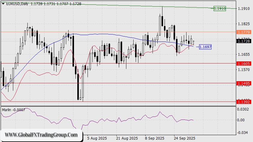 The upper boundary of the current range is marked by the October 1 high at 1.1779. A consolidation above this level would open the path toward the upper boundary of the price channel at 1.1910. However, this target may not be achieved if U.S. Treasury yields continue to decline. The MACD support line lies at 1.1697. A firm move below it would expose the target at 1.1605. The Marlin oscillator continues to drift horizontally along the zero (neutral) line.