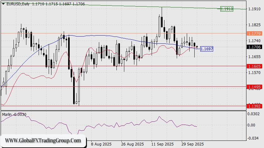 The price may rise further without signaling a stronger bullish rally and could reach the key level of 1.1779. A break above this level would open the way toward the upper boundary of the price channel around 1.1910. However, the Marlin oscillator remains unwilling to return to positive territory, which suggests that the potential for a price rally is somewhat limited. As a result, the 1.1910 target may stay out of reach.