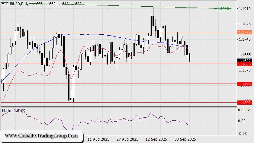 However, this otherwise clean technical outlook is being clouded by several factors: the weekly gap from Monday remains unfilled, U.S. stock markets are near all-time highs, the yield on 5-year U.S. Treasury bonds is stable at Friday’s closing level, and daily trading volume remains below average. In other words, there is no obvious capital flight — the euro is falling because of internal factors, possibly due to the recent resignation of French Prime Minister Sebastien Lecornu.