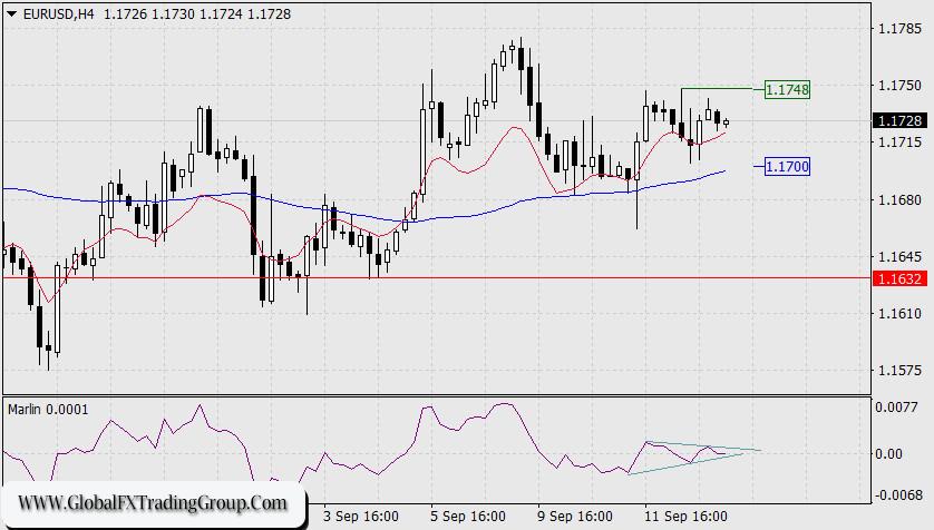 On the four-hour chart, the price is moving within the 1.1700/48 range, formed by the MACD line and Friday’s high. The Marlin oscillator forms a wedge pattern pointing downward, suggesting the price will attempt to stay below the MACD line (1.1700).