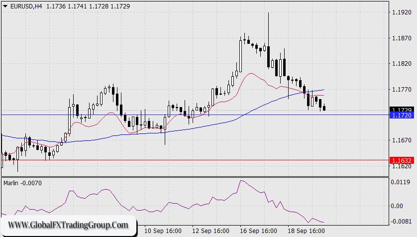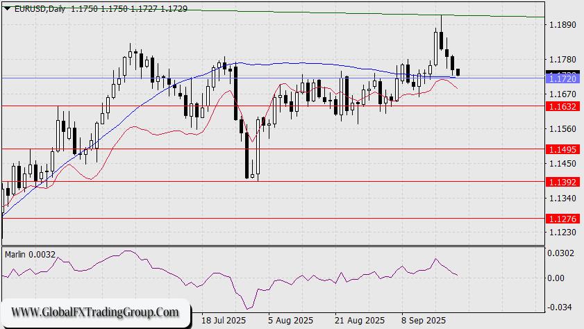 The euro exchange rate has approached the support of the daily Kijun line (1.1720). A consolidation below this level would signal that the EUR/USD pair is ready to continue its decline toward the target level of 1.1632 (the peak from June 12).