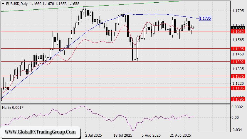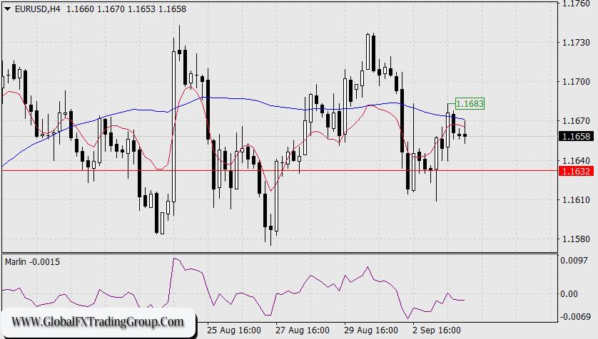 As of Wednesday, the euro rose by 20 points, postponing the consolidation below the 1.1632 level to a slightly later time. Possibly, today’s candle will close below support, since the ISM Services PMI for August is expected to rise from 50.1 to 50.9.