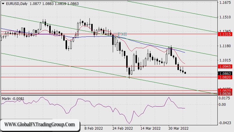 The euro continues to decline, although it has slowed down. It has a technically and ideologically important support at 1.0820 ahead of it, overcoming which opens the target of 1.0636 – the low of March 2020, therefore, in order to overcome such an important support, you need to gather your strength.