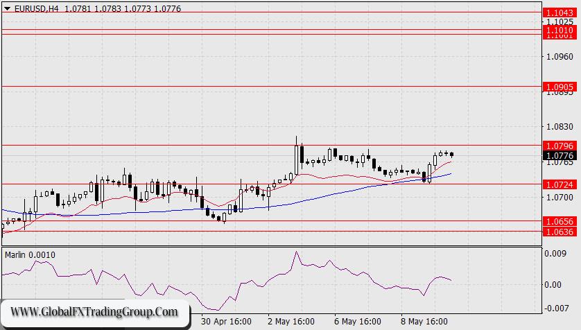 On the 4-hour chart, the price is trading in the range of 1.0724/96, above the balance and MACD indicator lines. The Marlin oscillator has entered the positive area, but it seems to have plans to move back into the downtrend territory. The price will encounter one more support on the way to another support level at 1.0724 – the MACD indicator line, so the way to this support may take around 2-3 days.
