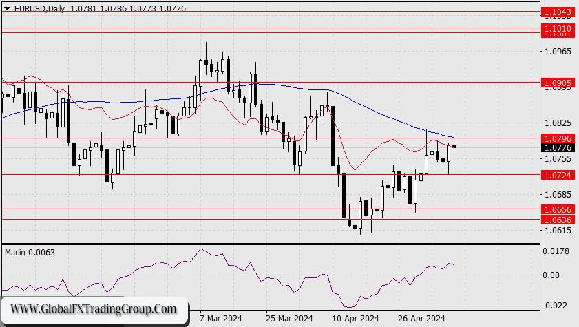 This morning, the price climbed above the balance indicator line on the daily chart, so it has a chance to work off the key resistance at 1.0796 (February 29 low). The MACD line is close to this level, so consolidating above it will allow the euro to reveal an alternative plan so it can rise to the target level of 1.0905. Also, the level of 1.0796 coincides with 50% of the corrective move from March 8-April 16. The main scenario assumes a price reversal, moving away from 1.0724 and heading towards the target range of 1.0636/56.