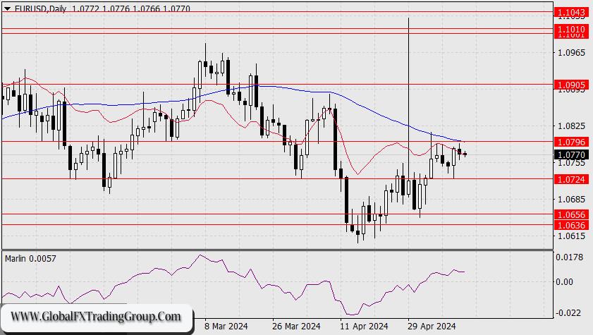 The euro edged down on Friday, failing to reach the target level of 1.0796. Perhaps this is a reversal, and the price may reach the support at 1.0724, but if risk instruments like oil and stock markets do not fall on Monday, which is unlikely since oil prices lost 1.74% (WTI) on Friday, there is still a chance.