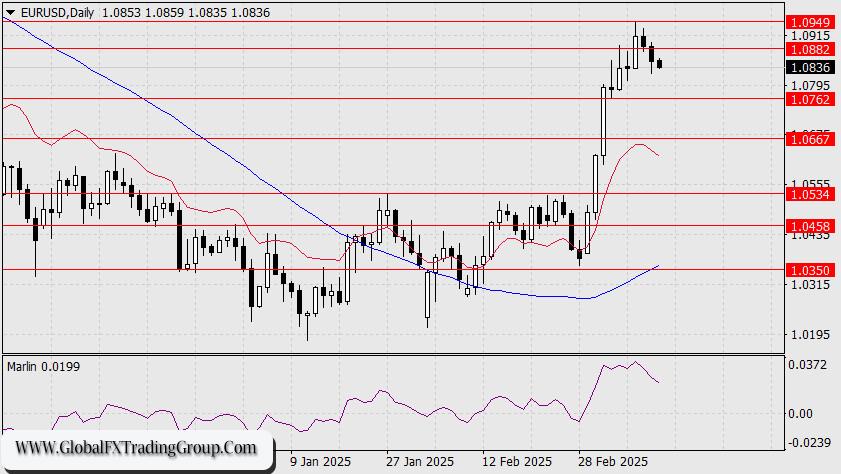 This image is no longer relevant If the price chooses to stabilize until the Federal Reserve meeting on March 19, it is unlikely to fall below 1.0762. Overall, the uptrend does not seem to be finished, and we anticipate that the high from March 11 will be surpassed. The decline of the Marlin oscillator appears more as a cooldown from the overbought zone rather than a sign of reversal, suggesting further growth ahead.